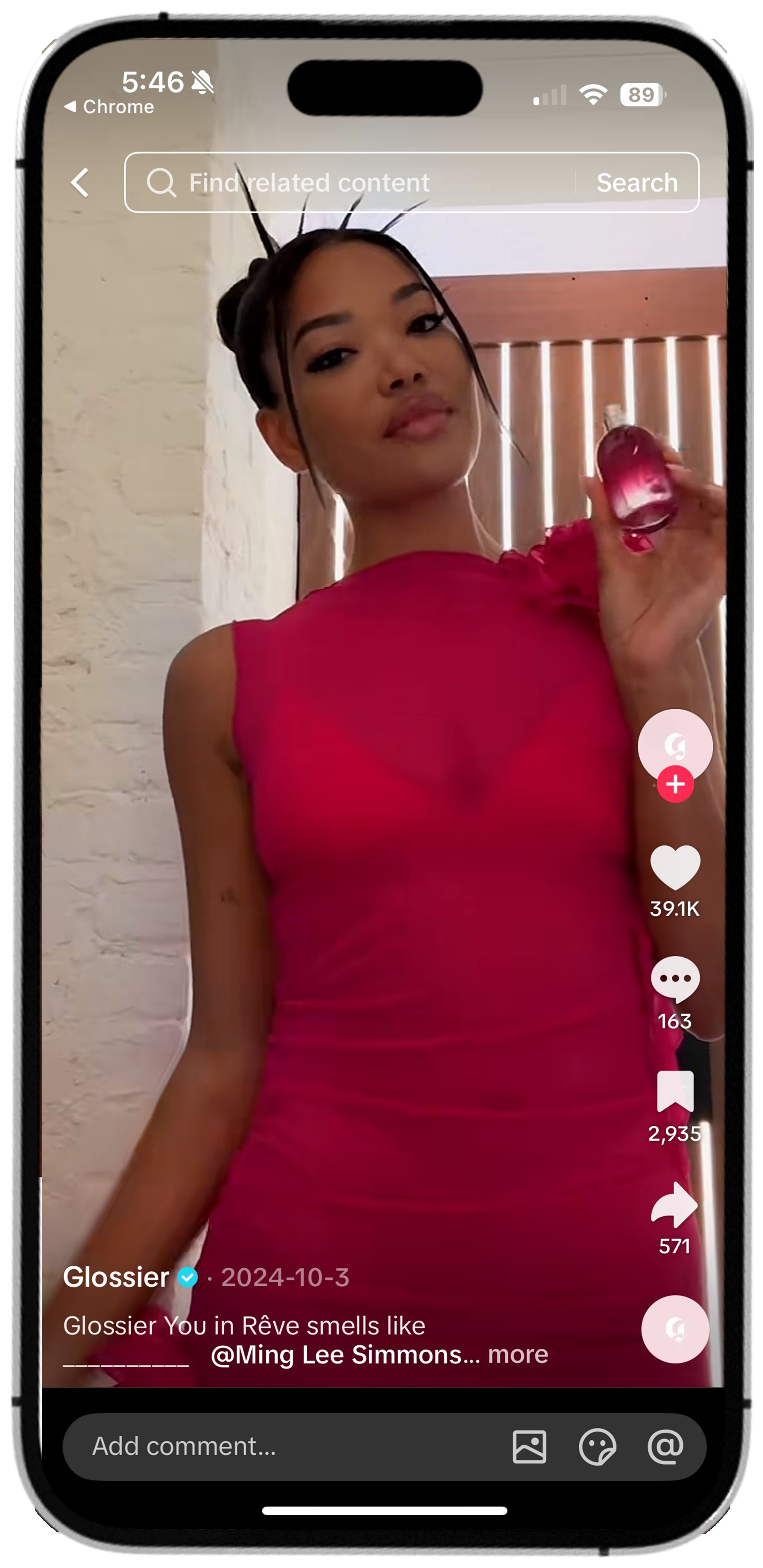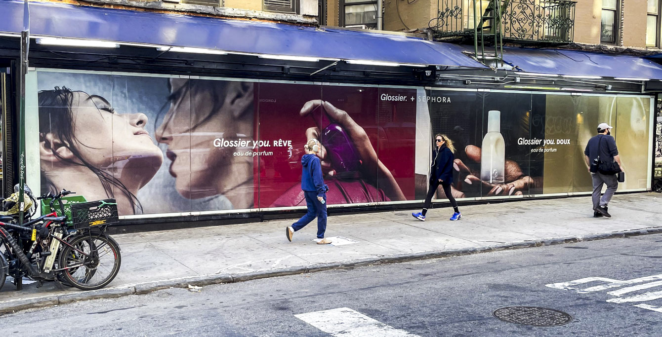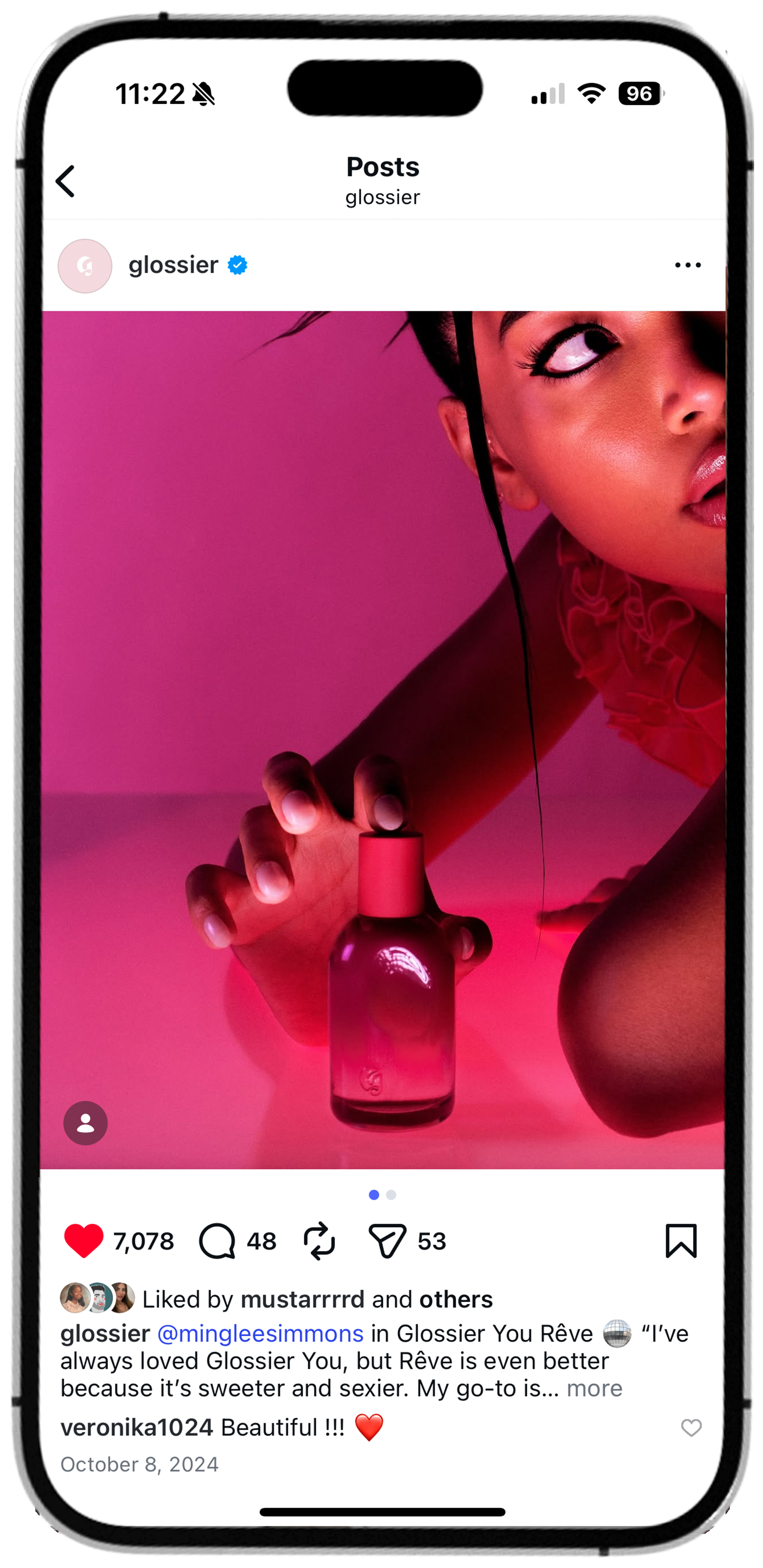 The 360 rollout included an extensive social tease period to build anticipation for Glossier’s first new scents in many years, a dual hero film and image launch, treating Doux & reve as separate (but sister) worlds, OOH across NYC streets, influencer gifting, cadenced homepage takeovers, and customization of the Sephora Atrium and digital billboard in Times Square.