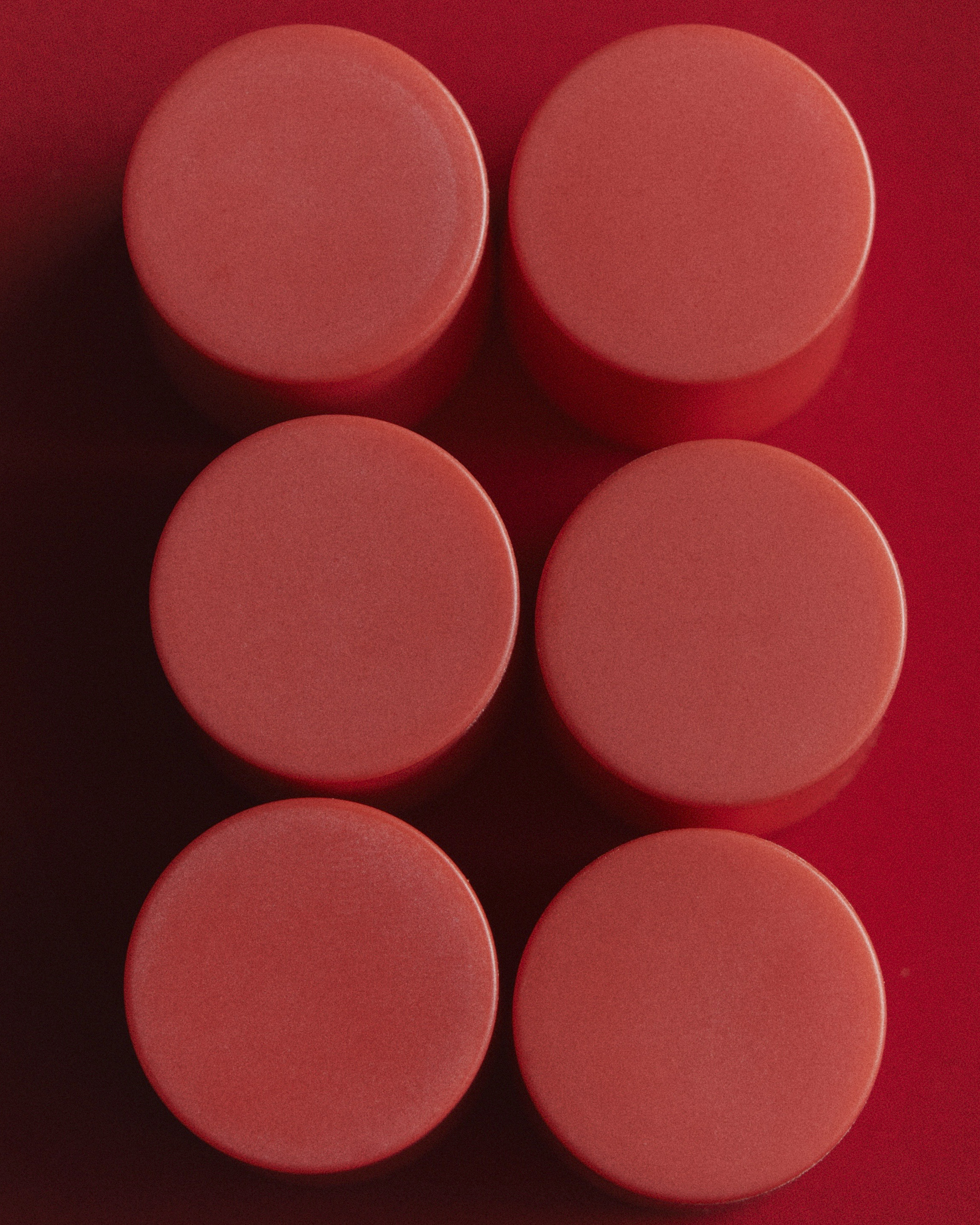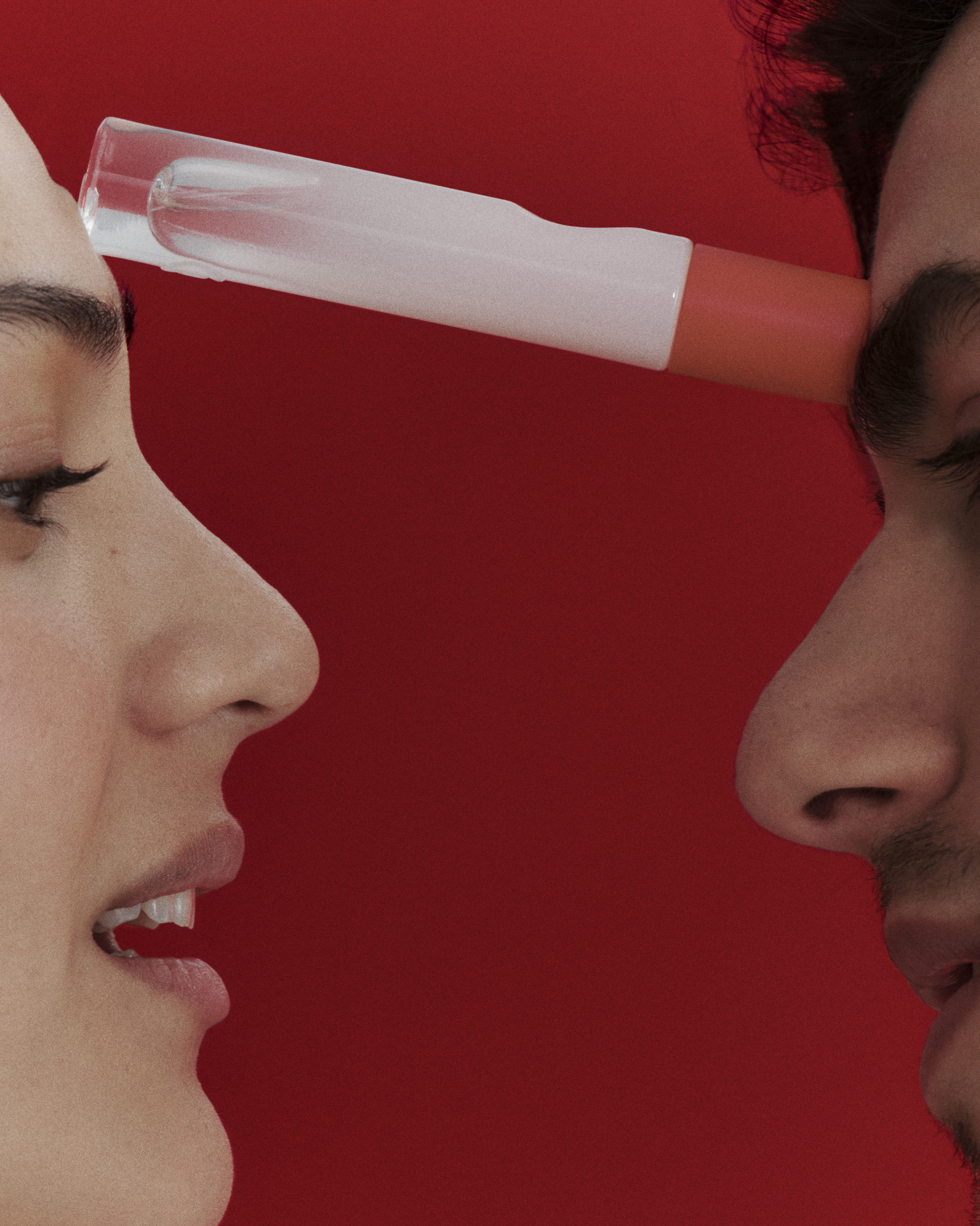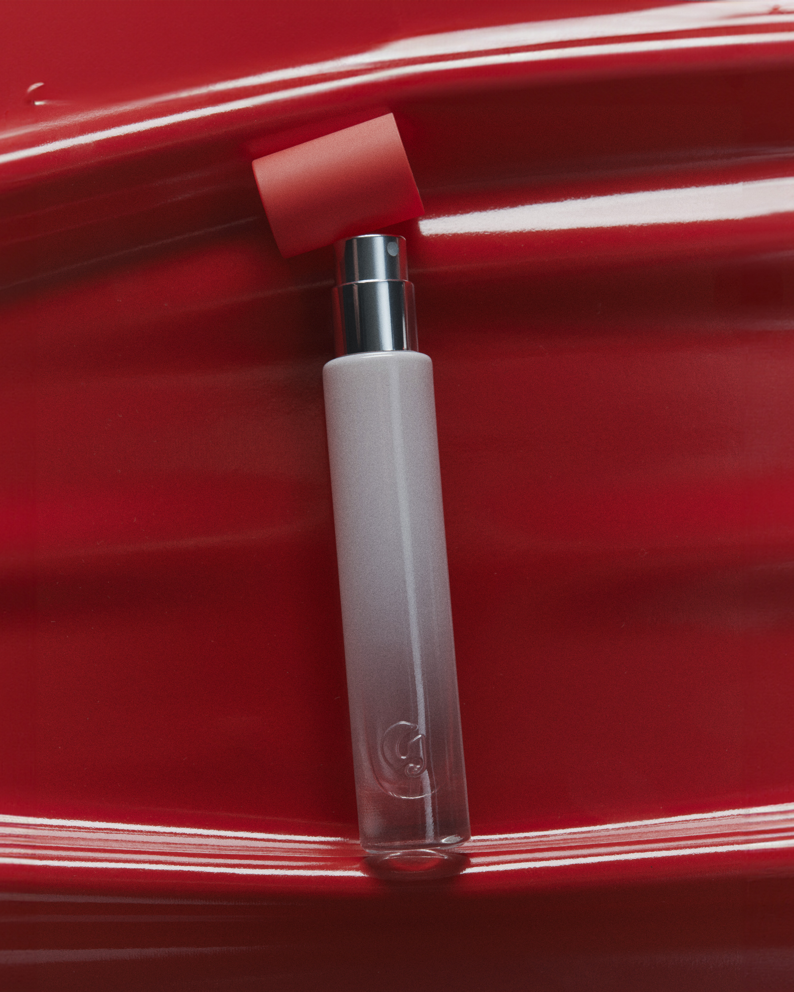 The color red (ie, red rubber band, cap and packaging accents on the OG Glossier You). Red appears across touch-points to reinforce the Glossier You identity.
